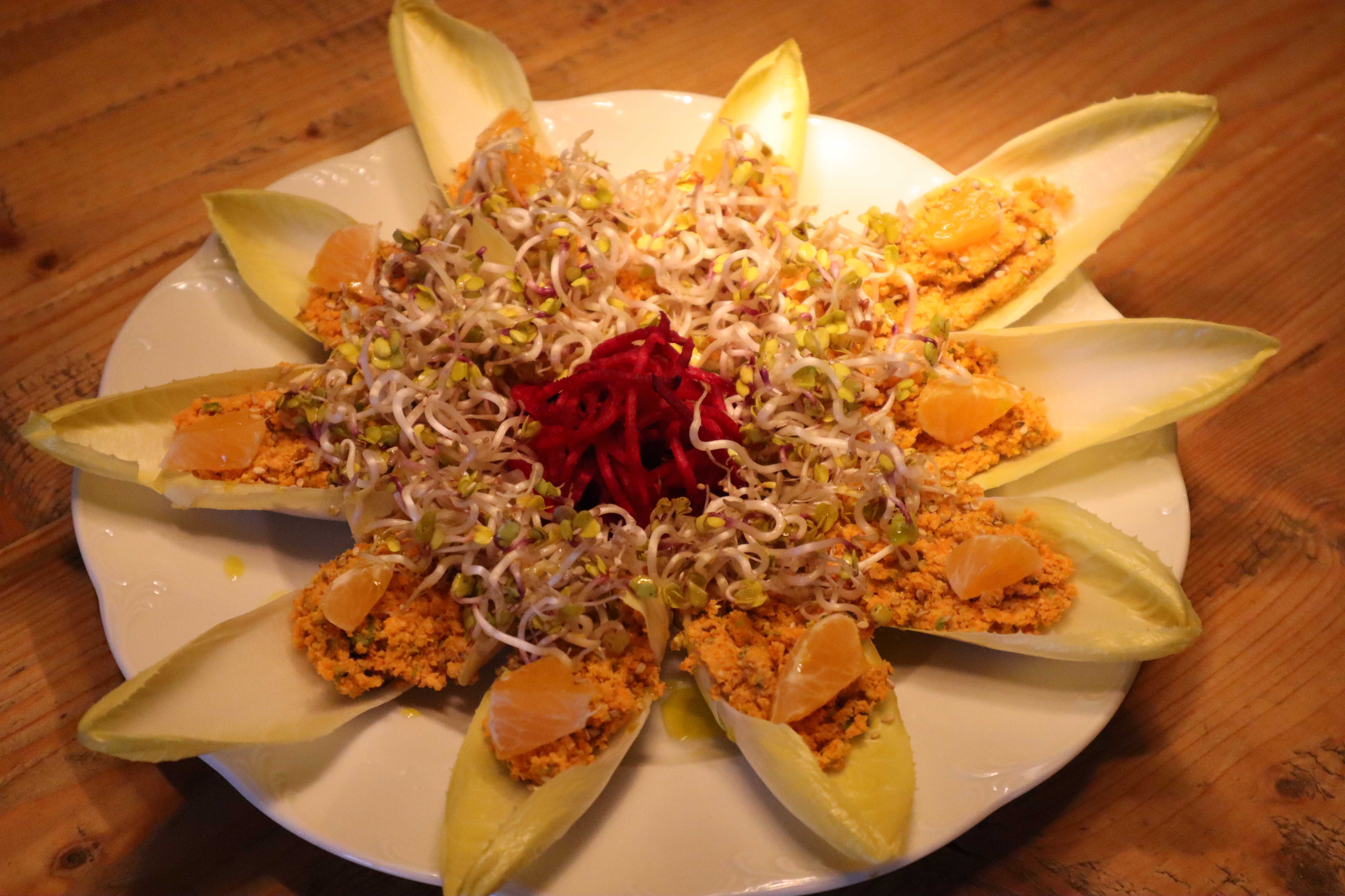 RE: Rohkostrezepte - Pamina - 29.06.12019 Rohkost-Pfannkuchen Zutaten für die Pfannkuchen bzw. das Fruchtleder 5-6 sehr reife Bananen 1,5 Esslöffel gemahlene Flohsamen Zutaten für die Vanillecreme 200 g Cashews 1 Teelöffel Vanille (Rapunzel) 1 Esslöffel Apfeldicksaft (Soyana, roh) Saft einer Zitrone Füllung Erdbeeren oder geraspelte Äpfel oder Beeren Dekoration Kakaobohnen-Stückchen Carobsirup Pfefferminzblatt Essbare Blüte Zubereitung Die Bananen im Vitamix sehr fein pürieren. Die Flohsamen untermischen. Wird dann im Dehydrator getrocknet. Dafür auf ein Blech mit Folie wenige Millimeter dick streichen. Ca 8-10 Stunden trocknen, bis die Masse vollständig getrocknet ist und sich lösen lässt. Die Creme herstellen. Dazu alle Zutaten im Vitamix pürieren und kaltstellen. Das Fruchtleder in Quadrate schneiden und mit Frucht Deiner Wahl füllen. Die Creme kann ebenfalls auf das Fruchtleder gestrichen werden. Rollen und mit der Creme nochmal bestreichen und nach Wünsch dekorieren. Für den Apfelstrudel das Fruchtleder mit geriebenen Äpfeln füllen. Dazu die Äpfel mit etwas Zitronensaft und Zimt mischen und auf das Fruchtleder geben. Rollen und mit Vanillesauce servieren. Vor dem Servieren die Pfannkuchen oder der Strudel etwas stehen lassen. Ein kinderleichtes Rezept. Das Fruchtleder hält sich gut mehrere Wochen im Kühlschrank, und so hat man ganz schnell einen leckeren Nachtisch. Guten Appetit! RE: Rohkostrezepte - Pamina - 15.12.12019 Bunte Rohkostschiffchen Wer sagt denn, daß Rohkost im Winter fad und farblos sein muß? Dieses schnelle Gericht zaubert Farbe auf den Teller und wird überwiegend aus saisonalen und heimischen Gemüsesorten zubereitet. Zutaten: einen Chicoree etwas Rote Bete, geraspelt Sprossen, zum Beispiel Radieschensprossen Mandarinen, in Stücken 3 Möhren eine Handvoll Walnüsse 2 Eßlöffel Pistazien Salz etwas Öl (Olivenöl oder Pistazienöl) Zubereitung: Die Möhren schälen und mit den Walnüssen und Pistazien in der Küchenmaschine zu einer Masse häckseln, ähnlich der Konsistenz von Reis. Nach Geschmack salzen. Den Chicoreeschiffchen mit der Möhren/Nußmischung füllen und auf einen Teller legen. Anschließend mit den Sprossen, Rote Bete und Mandarinenstücken nach Wunsch belegen. Mit etwas Öl beträufeln. Guten Appetit! RE: Rohkostrezepte - Pamina - 12.12.12020 Dieses Rezept mache ich ganz oft. Ich wollte es für eine Freundin hier reinstellen und habe es dann bereits im Ordner entdeckt! Sirona hat es vor langer Zeit schon reingestellt. (23.04.12012, 10:56)Sirona schrieb: https://forum.alter-weg.de/post-41627.html#pid41627Chiasamen-Knäckebrot Es ist ein sehr schnelles und leckeres Rohkostbrot, und ich nehme dieses Rezept als Grundrezept für unterschiedliche Geschmacksrichtungen. Heute habe ich ein Teil des "Teiges" mit Sauerkraut vermischt, meine momentane Lieblingsvariante. Oder mit Hanfsaat, Sonnenblumenkernen, Sesam ergänzen. Oliven und getrocknete Tomaten schmecken ebenfalls als Zutat.