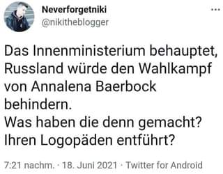 Politik - Wishmaster - 28.01.12022 Politik - Czar - 28.01.12022 Politik - Dancred - 22.02.12022 Politik - Anuscha - 22.02.12022 Pfosten-Schildkröte - Fulvia - 25.02.12022 Ein 75 Jahre alter Bauer wird von einem Reporter über seine Meinung zu Annalena Baerbock und ihrer Rolle als Außenministerin befragt. Der alte Bauer sagt: „Nun ja, wissen Sie, Frau Baerbock ist eine Pfosten-Schildkröte.“ Da er den Ausdruck noch nie gehört hat, fragt der Reporter zurück, was eine „Pfosten-Schildkröte“ sei? Der alte Mann sagt: „Wenn Sie die Landstraße runterfahren und an einem Zaunpfahl vorbeikommen, auf dem obendrauf eine Schildkröte ist, dann ist das eine „Pfosten-Schildkröte“. Der Reporter schaut noch immer verwirrt, also erklärt der Bauer weiter: „Du weißt, sie ist nicht alleine dort hinauf gekommen. Sie gehört dort nicht hin. Sie weiß nicht, was sie machen soll, während sie dort oben ist. Sie wurde höher hinaufbefördert als es ihre Fähigkeiten zulassen. Und DU wunderst dich, welcher Dummkopf sie dorthin gesetzt hat.“ Politik - Slaskia - 03.07.12022 |