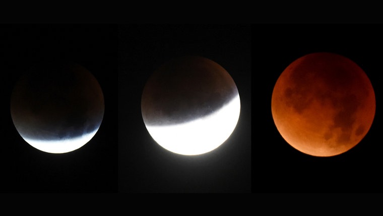 Erst verschwindet der Mond, dann wird er blutrot, taucht wieder auf und wird wieder zum Vollmond.