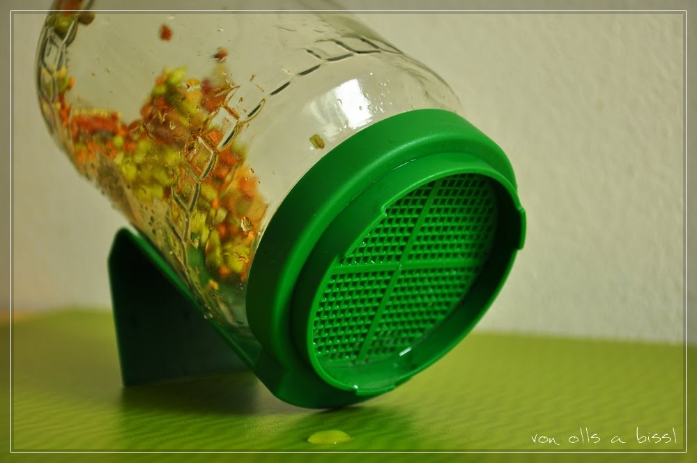 Ich habe eine Frage zu Senfsprossen: Laut Packung müssen die nicht eingeweicht werden, und sollen nach 3 Tagen "fertig" sein. Ich habe eine Art Gurkenglas mit Sieb als Schraubverschluss verwendet, die Senfsaat morgens und abends gut gespült, und nach 5 Tagen weggeworfen.