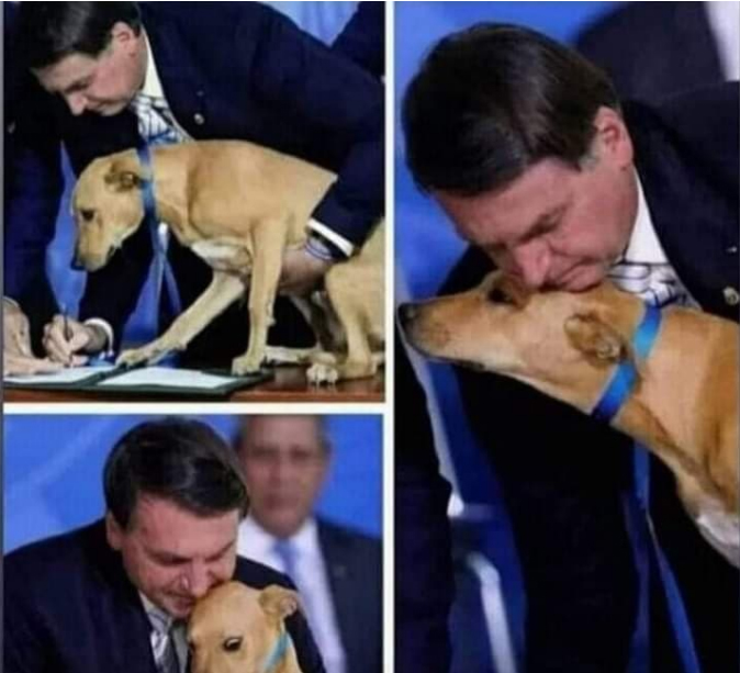 Das ist der Präsident von Brasilien, der in Anwesenheit seines Hundes ein Gesetz unterschreibt, welches Tierquälerei unter schwere Strafe stellt. Der Hund ist ein ehemaliger mißhandelter Straßenhund. Präsident Jair Bolsonaro sagte nach der Unterschrift zu seinem Hund: "Ich habe es Dir versprochen!"