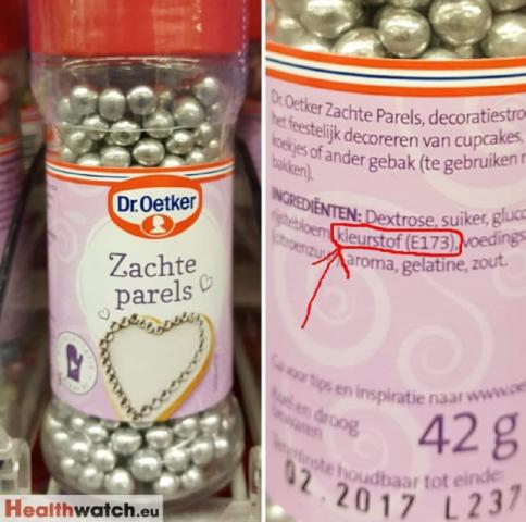 Solcher Deko-Mist für Kuchen enthält gefährliches Aluminium (E173), das Alzheimer und Demenz verursacht. Schon kleine Mengen können das Gehirn schädigen. In anderen Ländern ist das als Zusatz für Lebensmittel verboten.
