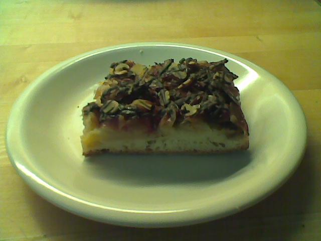 - jetzt auf das Backblech den ausgerollten Hefeteig; Puddingmasse darauf und glatt streichen; Streusel verteilen