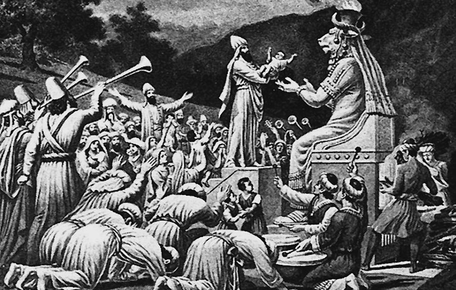 Männliche Kinder werden dem Moloch geopfert! So lautet die chr*stliche Bildbeschreibung. Als "Moloch" erkennen wir jedoch das bekannte Kuh-Symbol, ein Kennzeichen für Mutter Erde.