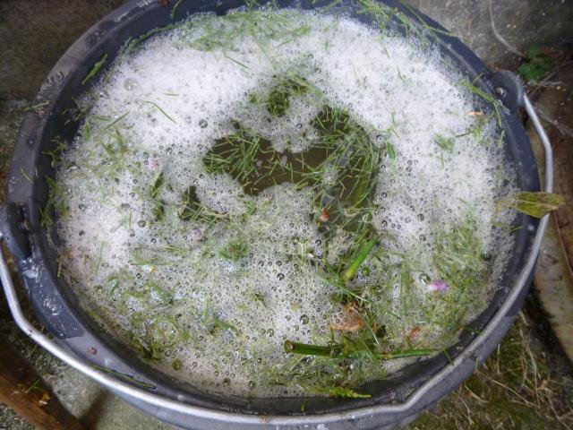 Die Pflanzenteile werden zerkleinert, in einen großen Eimer gegeben und mit 10 Litern Regenwasser vermengt.