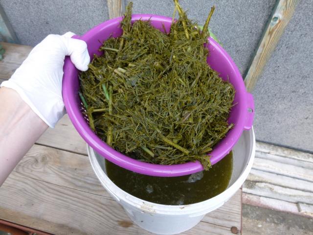 Die Jauche habe ich dann mittels eines Siebes in einen anderen Eimer abgegossen und die restlichen Pflanzenteile auf den Kompost gebracht.