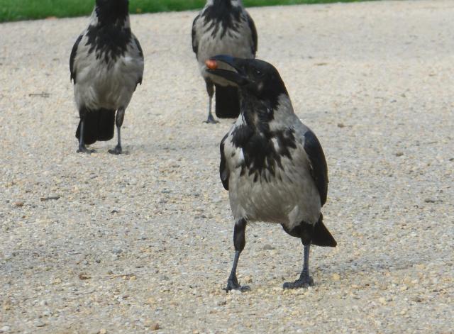 Um meinen Einflussbereich zu schützen, werfe ich inzwischen Kiesel nach den Raben, sobald ich sie in meinem Revier sehe. Denn genauso wie sie sich merken wo und von wem sie gefüttert werden, merken sie sich wo sie nicht willkommen sind. Lieber wärs mir natürlich wenn niemand selektiv zufüttert, alles im Lot wär, und ich sie in Frieden lassen könnt. Ist halt leider nicht so, drum muss ich diese wunderbaren Wesen hier in die Schranken weisen, weil ein anderer Mensch nicht nachdenkt über seine Handlung.
