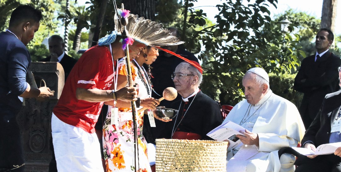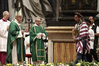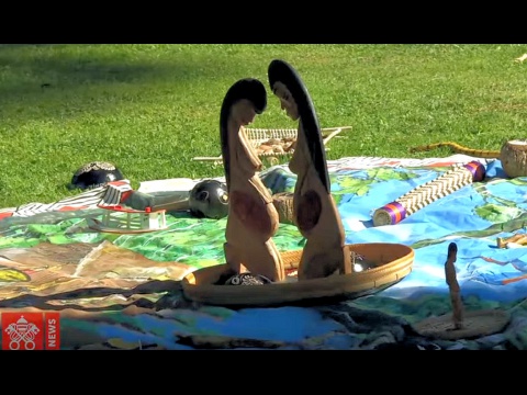 Amazonas-Indianer überreichen Papst Franziskus im Oktober heidnische Figuren.