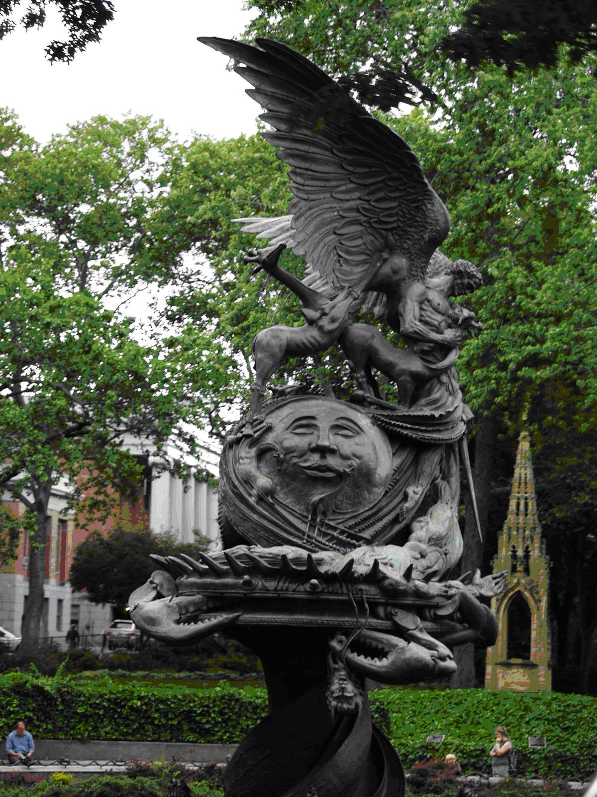 Diese Skulptur soll den Kampf zwischen Gut und Böse – Sonne und Mond (G*tt und Heiden) darstellen, und daß die Heiden Sonnenanbeter seien.
