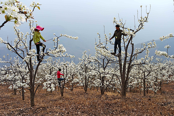 Horden von Arbeitern begehen die Plantagen und bestäuben die Apfel- und Birnenblüten per Hand. Ein guter Arbeiter schafft maximal zwei Bäume am Tag, das alles für einen Hungerlohn.