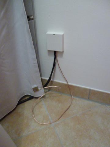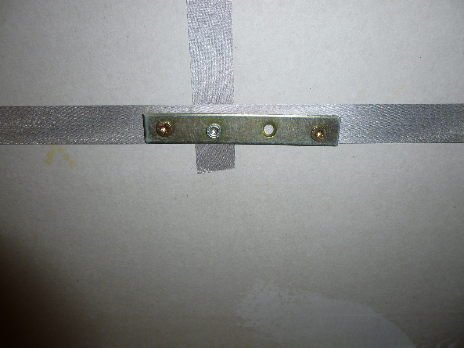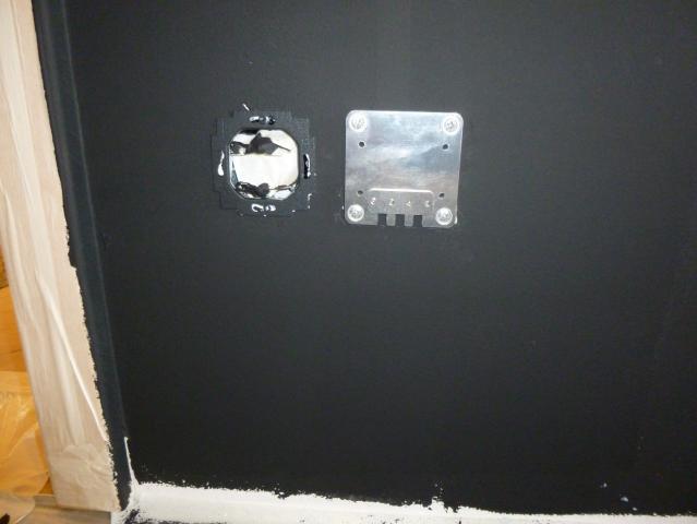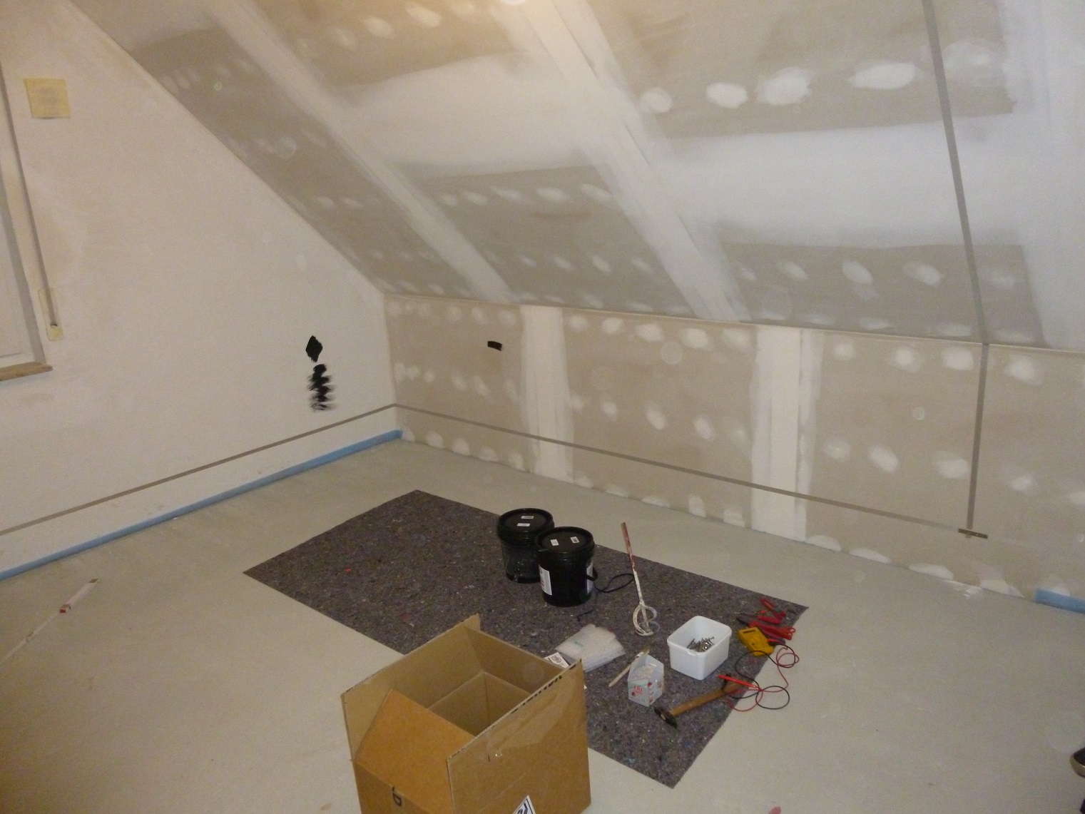 Ich habe dann mit Aluminium-Klebebändern, entsprechend den Vorgaben, die schwarze Fläche beklebt und noch ein weiteres mal übergestrichen. An die Aluminium-Bänder wird später eine Erdung angeschlossen, um die nun vollständig elektrisch leitende Wandfläche auf Erdpotential abzuleiten und somit auch gegen niederfrequente Einstrahlung nutzbar zu machen. Technisch betrachtet, habe ich durch das Aufbringen der Farbe einen sogenannten „Faradayschen Käfig“ um unser Schlafzimmer gelegt.