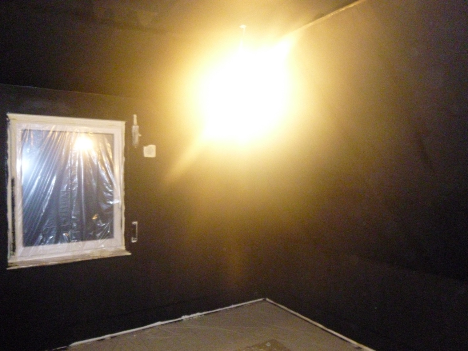 Um HF-Strahlung abzuschirmen, muß der „Käfig“ so dicht wie möglich sein. Das heißt also im Umkehrschluß, durch jede Öffnung des Käfigs kann Strahlung eindringen, sich reflektieren und damit wieder im ganzen Raum ausbreiten. Also mußten auch die Fenster und Türen behandelt werden. Aber schwarz gestrichene Fenster? Ich habe also ein sehr engmaschiges Edelstahlgitter als Gewebe besorgt und daraus ein Fliegengitter gebaut, welches von außen am Fenster befestigt wurde und somit auch gleich die kleinen „Blutsauger“ im Sommer auf Abstand hält. Ähnliches habe ich an den Türen unseres kleinen Nebenraumes getan. Jetzt kam die schwierigste Aufgabe: den schwarzen Raum wieder in ein freundliches und farbenfrohes Zimmer zu verwandeln. Das hat weit mehr Zeit und Farbe gekostet, als es schwarz zu bekommen.