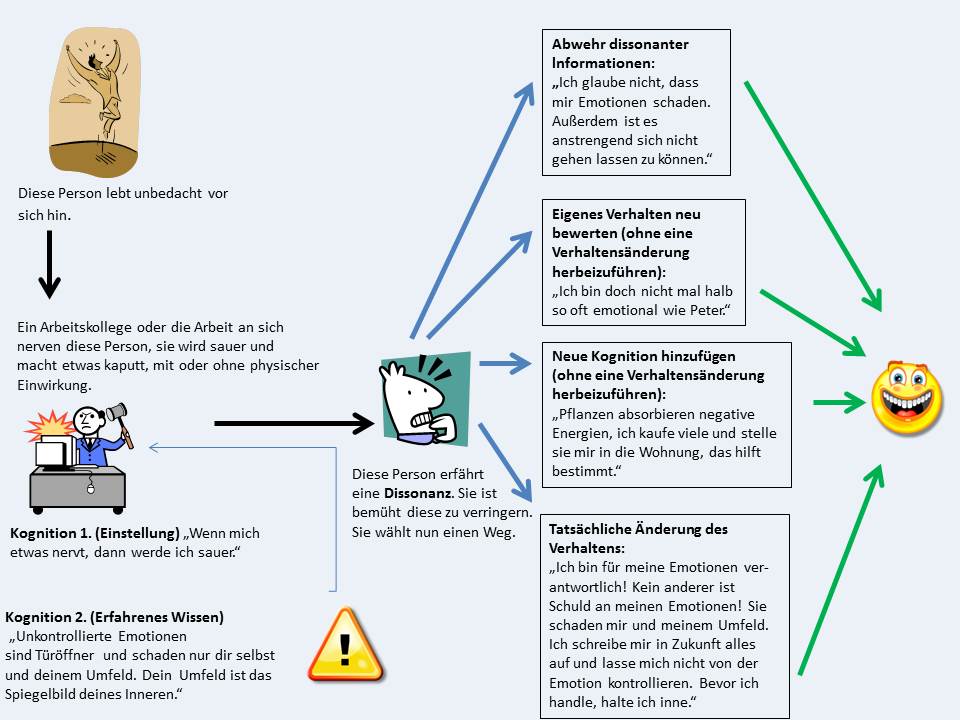 Der angestrebte Zustand wäre jedoch ein inneres Gleichgewicht bzw. Harmonie. Deshalb versucht die betroffene Person, die entstandene Spannung zu verringern.