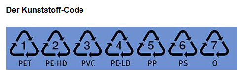 Polyethylen (Code 2 oder 4) und Polypropylen (Code 5) sind frei davon, diese Materialien sind sicher. Die hormonell wirksame Chemikalie verbirgt sich aber in Polycarbonat, das zusammen mit Acrylglas, Polyamid und anderem unter Code 7 fällt (die Abkürzung „O“ steht für „others“, „andere Kunststoffe“). PET (Code 1), PVC (Code 3) und Polystyrol (Code 6) enthalten kein BPA, aber eventuell hormonähnliche Weichmacher.
