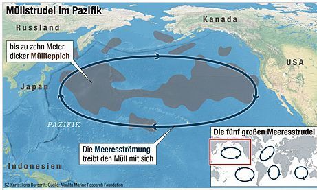 Was vielen unbekannt ist, ist daß Plastik sich nicht biologisch abbaut, sondern es zerfällt nur in immer kleinere Teilchen; dies führt dazu, daß die Meerestiere die kleine Plastikteilchen als Nahrung verwechseln. Somit sterben deshalb jedes Jahr hunderttausende durch giftige Inhaltsstoffe. Im Pazifik, östlich von Hawaii, hat sich ein gigantischer Wirbel aus drei Millionen Tonnen Plastikmüll gebildet, der sich durch die Meeresströmung im Kreis dreht. Die Plastikteile werden durch die Einwirkung von Wind, Sonne und Wellen zu immer kleineren Teilchen zerkleinert. Auch der Sand an den Küsten ist betroffen. Der Sand besteht bereits zu einem gewissen Prozentsatz aus Kunststoff Die ozeanische Müllhalde wächst nach und nach, Wissenschaftler schätzen, daß die Müllhalde schon doppelt so groß ist wie der US-Bundesstaat Texas.