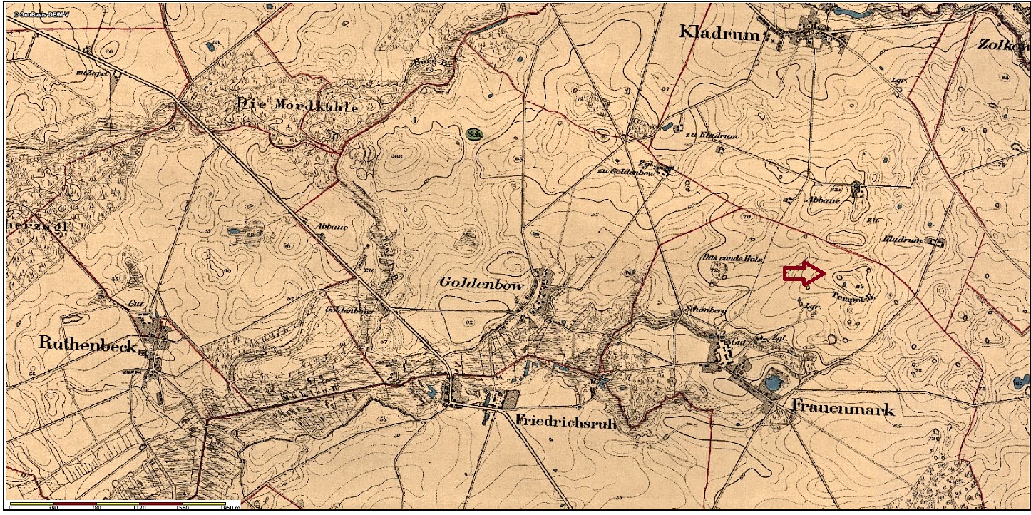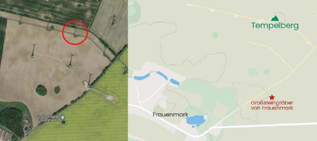 Auch befindet sich ein Tempelberg in der Nähe. Leider steht da jetzt ein riesiges Windrad – Zufall?? Wer weiß. Es ist jedoch nicht mehr viel übrig von dem „Berg“. Durch das Windrad ist jetzt dort eine riesige Kuhle. An den Baumreihen findet man noch unzählige Feldsteine…