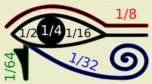 Das Horusauge ist das von Thot (Hermes) geheilte, wiederhergestellte linke Auge. Es wird auch als das Udjat- oder Udzat-Auge bezeichnet (udjat = intakt, vollständig, heil, gesund). Seth riss Horus ("Der Ferne") das linke Auge aus, als sich beide Rivalen im Kampf um den Thron von Osiris befanden, und zerschmetterte es, so dass es in sechs Teile zerfiel. Das linke Auge verehrte man als  „Mondauge“, während Horus‘ rechtes Auge auch als „Sonnenauge“ verehrt wurde. Die einzelnen Teile des Horusauges dienen als Bruchteile des Hohlmaßes Heqat (Auch "Hekat"), wobei 1 Heqat 4,8 Liter (bzw. 4,75 Liter gerundet) entspricht.