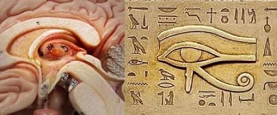Das von Thot geheilte und wieder erhaltene linke Auge benutze Horus aber nicht mehr selber, sondern setzte es seinem Vater Osiris als drittes Auge ein. Im Gehirn steht das „Auge des Horus“ für die Zirbeldrüse (Drittes Auge, Stirnchakra, Sitz der Intuition). "Zirben" ist Mittelhochdeutsch für "(Im Kreise) Drehen, Wirbeln - siehe auch die Zirbelkiefer, wo "Zirbel" in Verbindung mit der Form der Zapfen steht. Die Zirbeldrüse besitzt lichtempfindliche Zellen und fungiert als Lichtmesser innerhalb des Gehirns. Das Augenlicht wird über den Hypothalamus, die Schaltzentrale des Gehirns, in die verschiedenen Hirnregionen geführt. Ein Teil des Lichtes wird dazu verwendet, die Zirbeldrüse zu stimulieren.