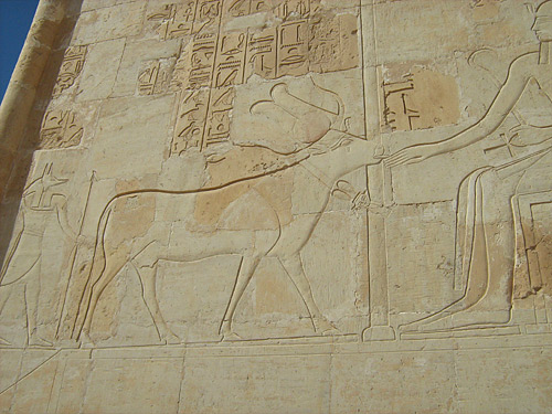 Die Göttin Hathor als Kuh leckt die Hand der Pharaonin Hatschepsut. Darstellung am Hatschepsut-Tempel von Deir el-Bahari.
