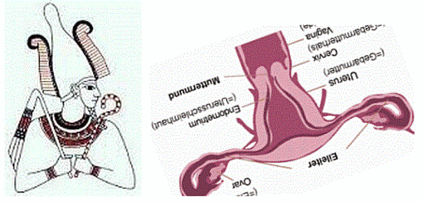In der Osiris-Krone dargestellt sind die Seitenwände der Gebärmutter (Uterus). Links und rechts von der sogenannten "Weißen Krone" sind die Stäbe mit dem Haken sichtbar, ähnlich dem Krummstab, den Osiris hält.
