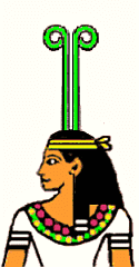 Die Geburtsgöttin Meschenet (auch: Mesechenet Meskhenet) wird meist mit einem Kopfschmuck dargestellt, der wie ein Rohr (oder Stab) nach oben geht und sich dann zu beiden Seiten spiralig einrollt.