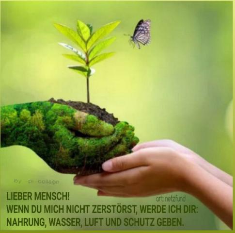 "Lieber Mensch, wenn du mich leben und sein läßt, werde ich dir Nahrung, Wasser, Luft und Schutz geben."