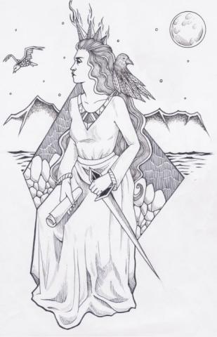 Hier noch eine andere Darstellung der Fjallkonan, wobei einige Attribute (Schwert, Schriftrolle, Rabe, Möwe, Mond und Sitzhaltung) die Seiten gewechselt haben. Einzig der Blick geht noch in dieselbe Richtung.