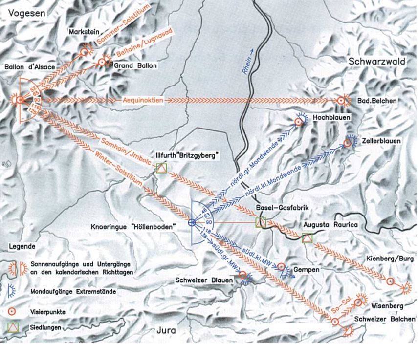 Zitat:Eines der vielen erstaunlichen Phänomene dieser Bergkonstellation wird sichtbar, wenn man die drei Belchenberge Elsässer Belchen, Schwarzwald Belchen und Jurabelchen verbindet: Es entsteht ein rechtwinkliges Dreieck, dessen Katheten eine Ost-West-Achse und eine Nord-Süd-Achse beschreiben. Aber das ist nicht alles. Die drei Berge liefern Markierungspunkte für Sonnenauf- und -untergänge, und zwar jeweils zu den Tagundnachtgleichen im Herbst und im Frühjahr sowie zur Wintersonnenwende. Vom Elsässer Belchen aus gesehen geht die Sonne zur Herbsttagundnachtgleiche exakt im Osten hinter dem Schwarzwälder Belchen auf. Bis zur Wintersonnenwende wandert der Sonnenaufgang Richtung Süden und geht am 21. Dezember hinter der Belchenflue im Jura auf. Zur Frühlingstagundnachtgleiche hat sie dann wieder ihren Stand im Osten hinter dem Schwarzwälder Belchen erreicht. Als vierter Belchenberg markiert der Kleine Belchen im Elsaß den nördlichsten Sonnenaufgangspunkt zur Sommersonnenwende. Danach wandert sie wieder nach Süden der Herbsttagundnachtgleiche entgegen. Dieses Bezugssystem gilt selbstverständlich auch für die Sonnenuntergänge. Zu den genannten Äquinoktien (Tagundnachtgleichen) und Solstitien (Sonnenwenden) geht die Sonne, von jeweiligen Belchenbergen aus beobachtet, hinter dem Ballon d'Alsace unter. Alle diese Daten hat die Bochumer Sternwarte im Jahr 1979 überprüft und bestätigt.