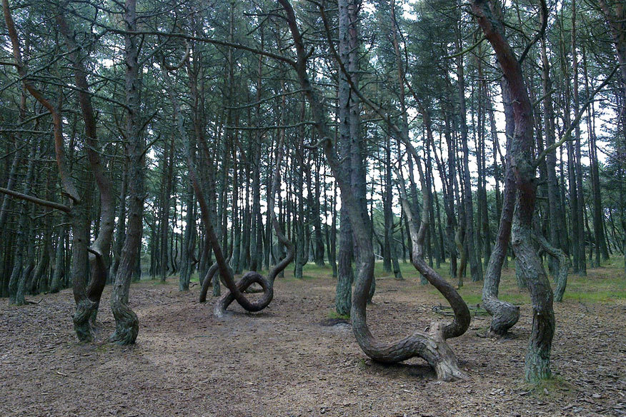 Nahe der heutigen deutsch-polnischen Grenze, eine halbe Stunde südlich von Stettin im Bereich des Oder-Nationalparks, kann man in dem kleinen 1,3 ha großen Waldstück eigenwillig wachsende Kiefern finden. Das Besondere an diesen Kiefern ist, dass sie knapp über dem Boden um 90° gekrümmt sind und im weiteren Verlauf einen sehr kurvig ausgeprägten Wuchs aufweisen.