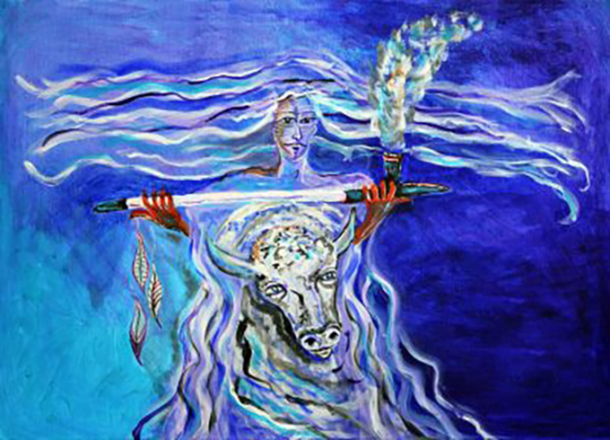 Jeden Morgen geht die Göttin Fulla mit ihrem Ochsen zum Taubrunnen und befüllt die beiden Schüsseln (die von den Enden einer Stange hängen, welche über den Hörnern des Ochsen liegt) mit Tau.