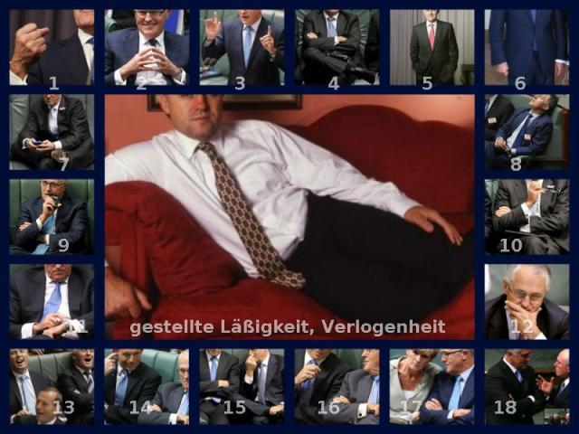 Malcolm Turnbull besitzt eine ähnlich deutliche Körpersprache. Von Geldgier und Machtwahn bis hin zu Kriegshysterien ist alles vertreten. Jeder darf sich (nachfolgend) gern selbst in der Deutung probieren.