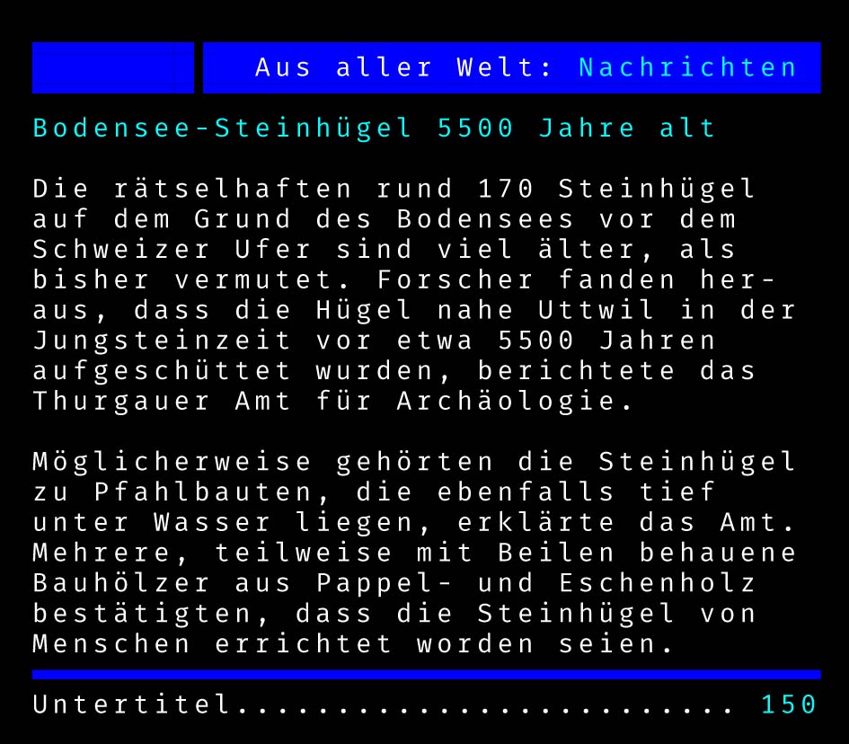 Zitat:Die rätselhaften Steinhügel im Bodensee stammen vermutlich aus der Bronzezeit