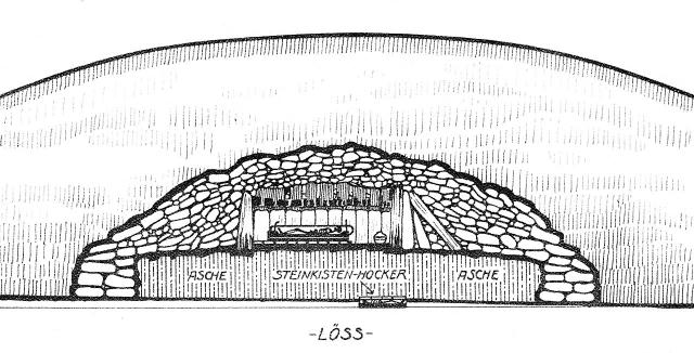 Hier sieht man den typischen Aufbau eines Hügelgrabes. Man erkennt die Steinkiste und die darüber angeordneten/aufgehäuften Steine. So, wie sie im Bodensee aufgefunden worden sind. Der Sand, der den großen Hügel gebildet hat, ist natürlich nicht mehr vorhanden Man kann also einen Vergleich herstellen. Interessant ist hier, daß diese Art des Aufbaus für Fürsten- und Hünengräber dokumentiert ist. Es scheint sich also um höher gestellte Persönlichkeiten gehandelt zu haben. Auch die Lage an einem Gewässer passt zu der Bestattungsart.