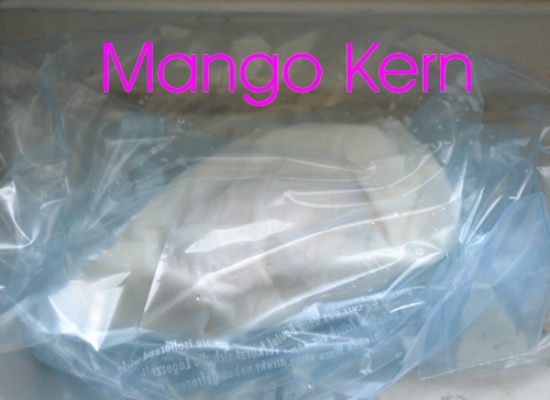 Frucht schälen und Kern freilegen. Der innere Kern steckt in der Schale vom Freigelegten. Der Mangokern hat eine Stelle die aussieht wie eine Nase, und unterhalb dieser "Nase" befindet sich eine kleine Kerbe/Delle, und dort bricht man vorsichtig mit dem Messer den Kern auf. So erhält man den Samen. Jenen packt man in ein nasses Küchenpapier oder Taschentuch, packt es in eine Folie und legt sie in die Sonne (Küchenfenster).
