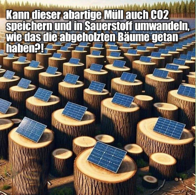 Meine Gegenfrage lautet: Warum reißen sie dann nicht ein paar schmutzige Industriegebiete ab, die sowieso keiner haben will? Da können sie dann so viele Windräder hinbauen wie sie wollen! Aber nein, es müssen unbedingt der Wald und die Bäume sein, die dran glauben müssen – denn die sind ja völlig unnütze.