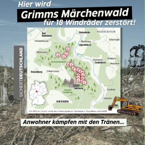 Das Schicksal von Abertausenden Bäumen im hessischen Naturpark Reinhardswald ist besiegelt. Ein Teil des bis zu 800 Jahre alten Waldes, dem Märchenwald der Brüder Grimm, wird – obwohl noch Klagen anhängig sind – abgeholzt, damit dort – nach dem Willen der Grünen – 18 Windkraftanlagen errichtet werden können.