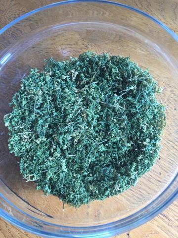 Meine Artemisia-Blätter sind nun bereit fürs Verpacken. Bei mir hat die Trocknungszeit ungefähr 10 Tage gedauert, habe sie sogar noch etwas länger liegen lassen (aus Zeitmangel). Sie wurden im Haus getrocknet, in einem gut belüfteten, relativ dunklen Raum.