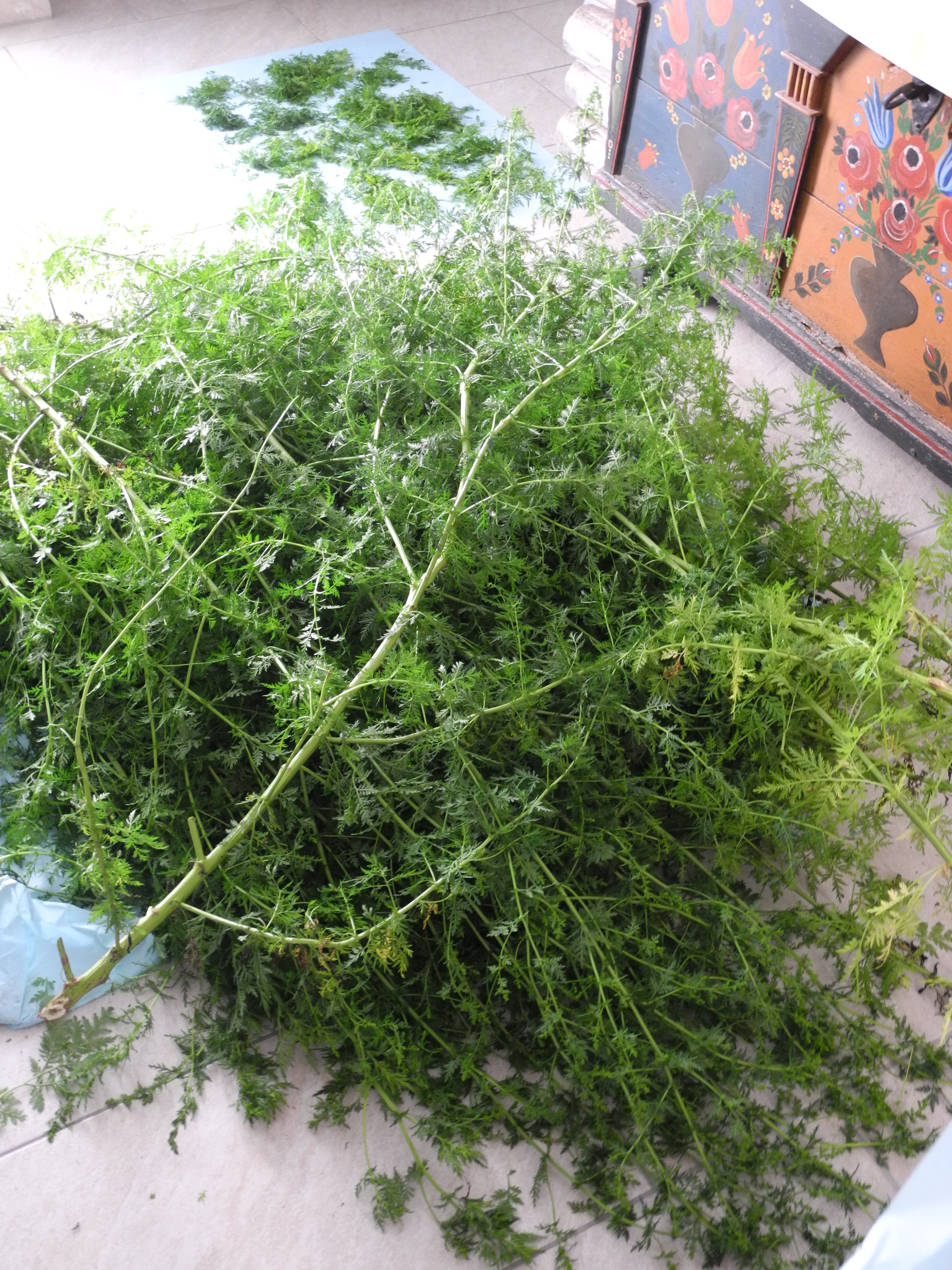 Meine 11 Artemisia-annua-Pflanzen im Beet waren jetzt ungefähr 1,40 m hoch, und ich sah schon, dass sich Blüten entwickelten. Deswegen wurde vor ein paar Tagen geerntet. Die Artemisia annua in den Töpfen war ungefähr 80 cm hoch und auch schon reif für die Ernte. Auch hier waren es 11 Pflanzen.