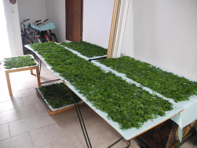 Die gesamte Ernte beim Trocknen - in einem gut durchlüfteten Raum. Bin gespannt, wieviel Gramm die Blätter in getrockneten Zustand ergeben!