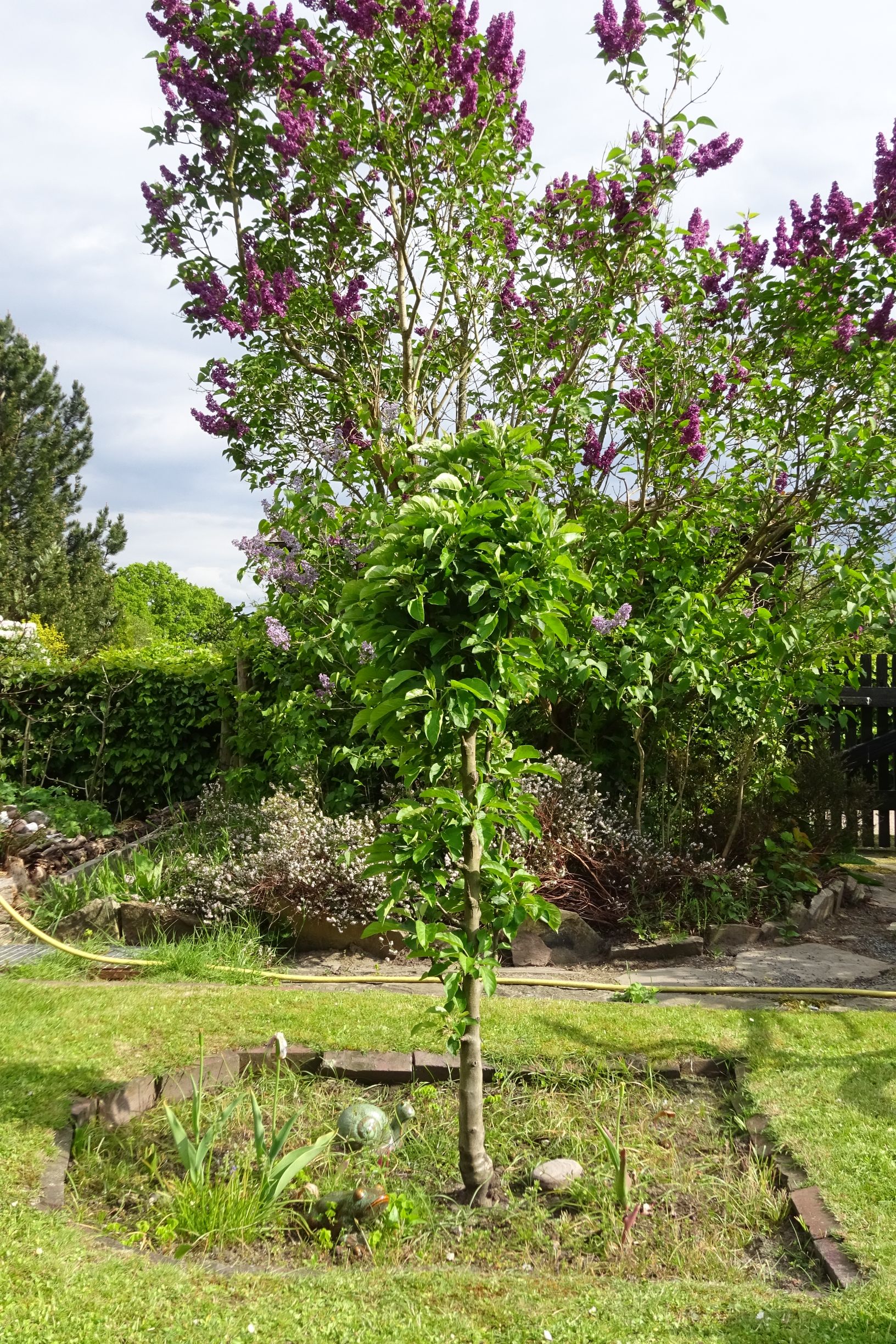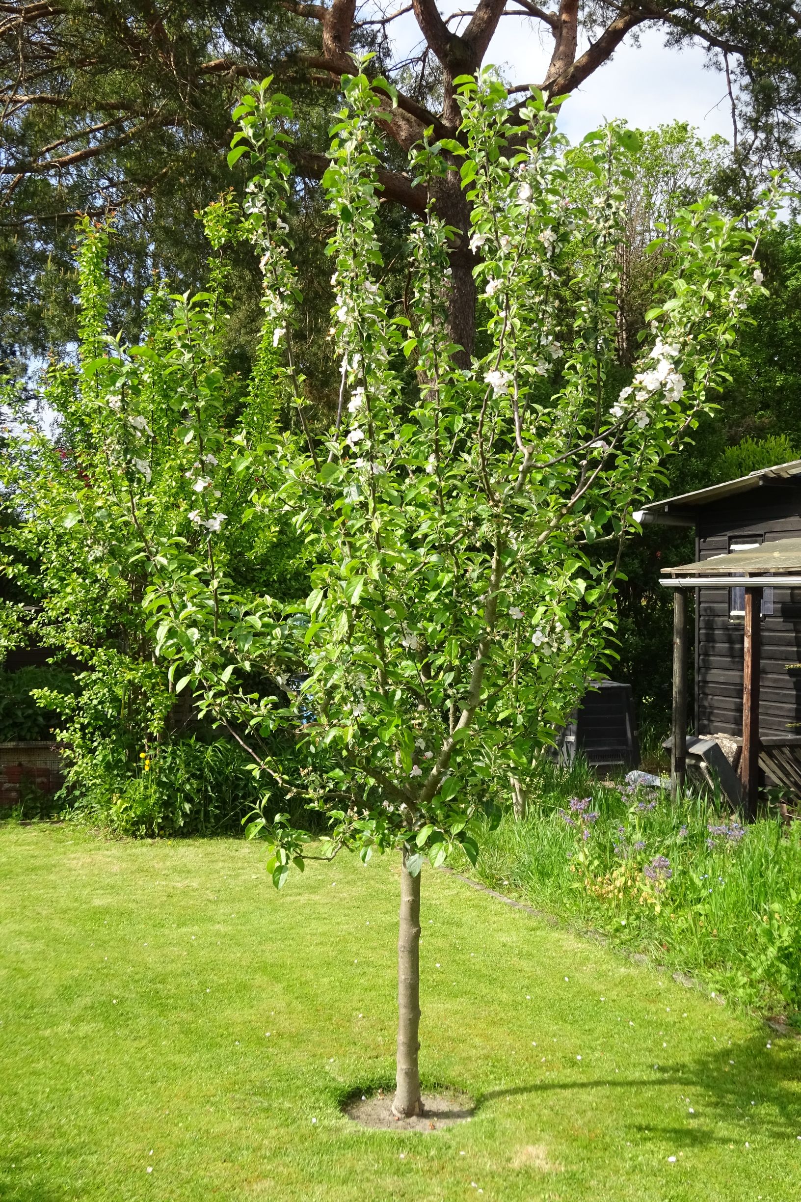 So steht das Bäumchen nun in unserem Garten und darf seinen "Einzelkindstatus" genießen. Zur Befruchtung steht ein sehr alter großer Apfelbaum in der Nähe. Unser "Kleiner" steht in einem Blumenbeet, und scheint die schönen Blumen um ihn herum zu mögen. So war der Boden nie ausgetrocknet, und im Frühling und jetzt im Sommer sah das auch sehr hübsch aus.