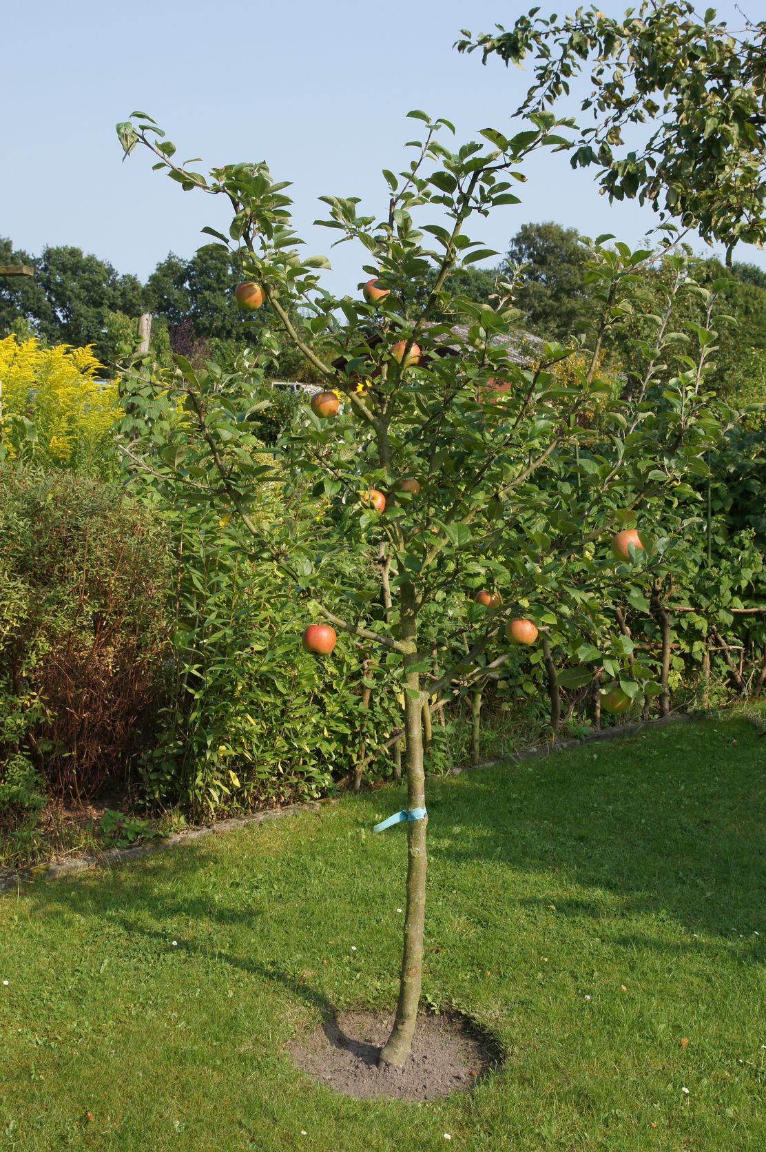 Mir gefiel, daß diese Sorte keine Monokultur mag; hier reagiert das Bäumchen kränklich, und so wird er kaum noch kommerziell angebaut. Wir hatten auch nicht allzu viel Platz mehr frei und wollten aber unbedingt einen Apfelbaum, der nicht allzu groß wird, aber dennoch gut trägt. Die Wahl viel also auf der goldene Apfelbaum.
