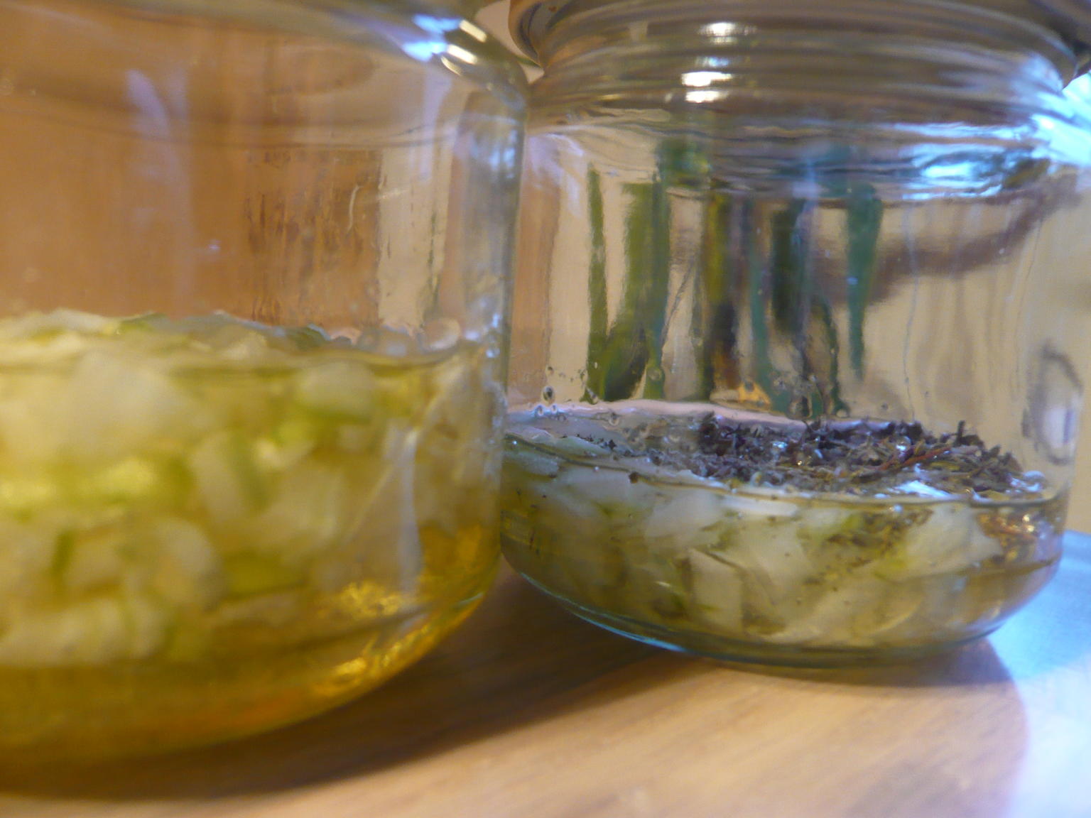 Die Gläser mit dem Thymian habe ich jedoch mehrere Tage auf der Fensterbank stehen lassen, damit die Thymian-Wirkstoffe gut gelöst werden konnten. Der Thymian hat den Sirup deutlich bräunlicher gefärbt.