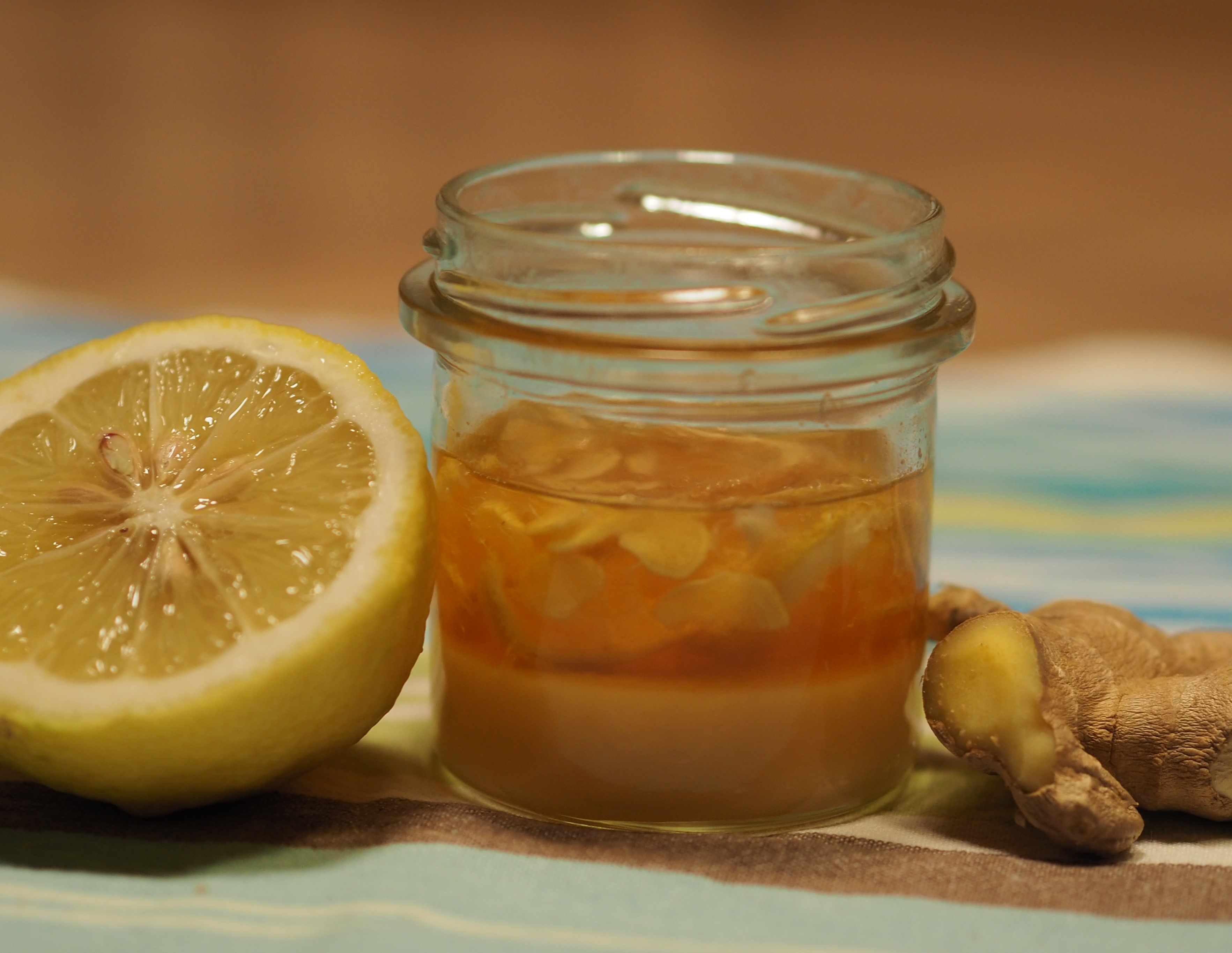 Die gewaschene und in feine Scheiben geschnittene Zitrone und den ebenfalls in feinen Scheiben geschnittenen Ingwer abwechselnd in ein Schraubglas schichten und mit Honig übergießen, bis alles bedeckt ist.