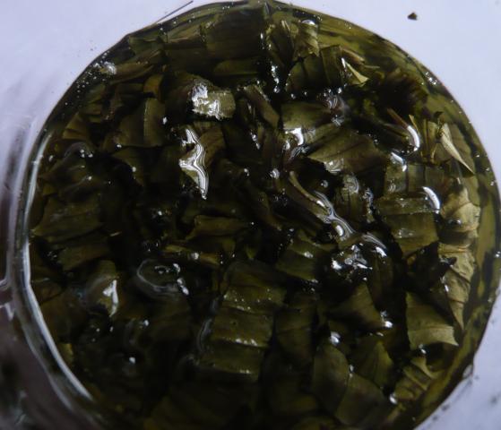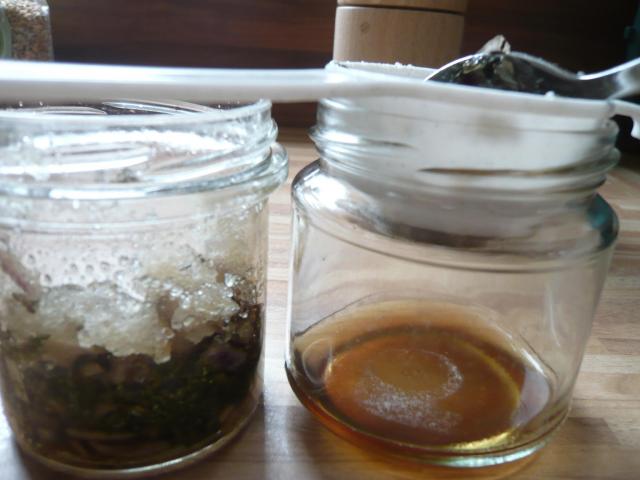 - in ein Schraubglas geben und dort noch mit einem Holzspatel auf die Blätter drücken, damit sich die Wirkstoffe im Anschluss besser lösen