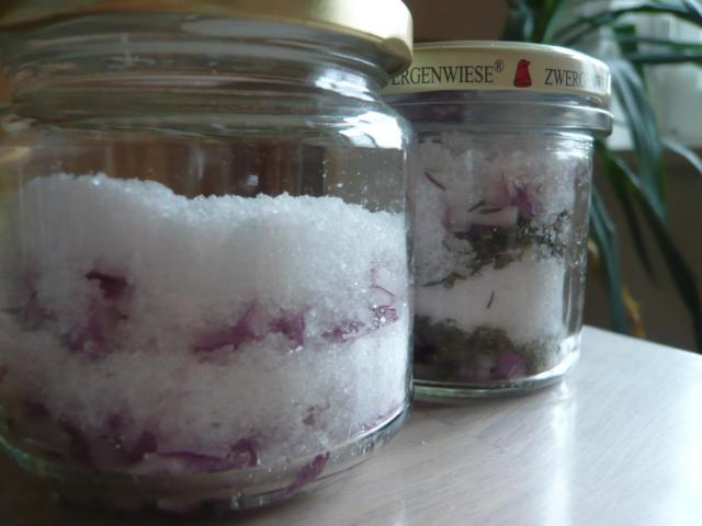 - rote Zwiebeln (milder im Geschmack) mit Xylit; alternativ zusätzlich mit getrockneten Thymian