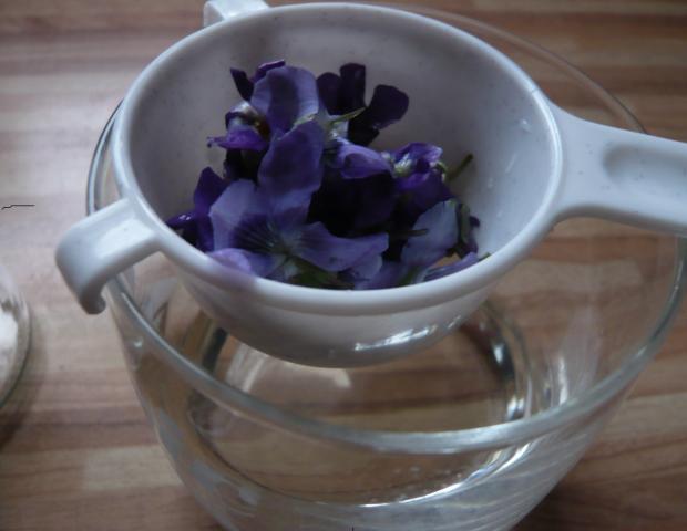 (Beim Veilchen-Sirup den Honig vorab im warmen Wasser lösen, abkühlen lassen und dann über die Blüten geben.)