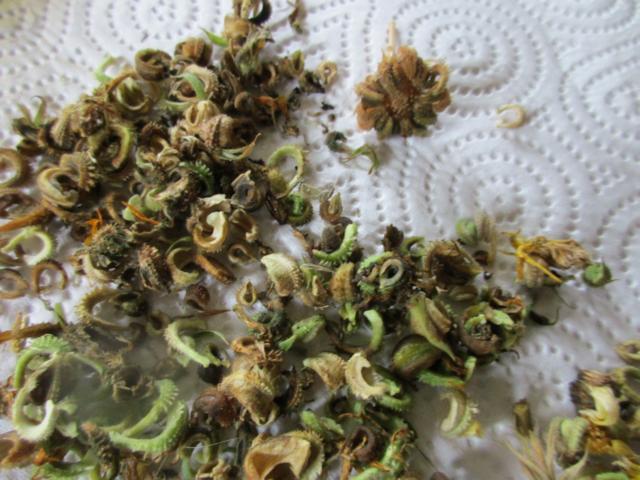 Links noch eine geschlossene, dann trocknen sie immer mehr ab und öffnen sich. Darin liegen die Samen, die schwarzen kleinen Dinger, rechts im Bild.