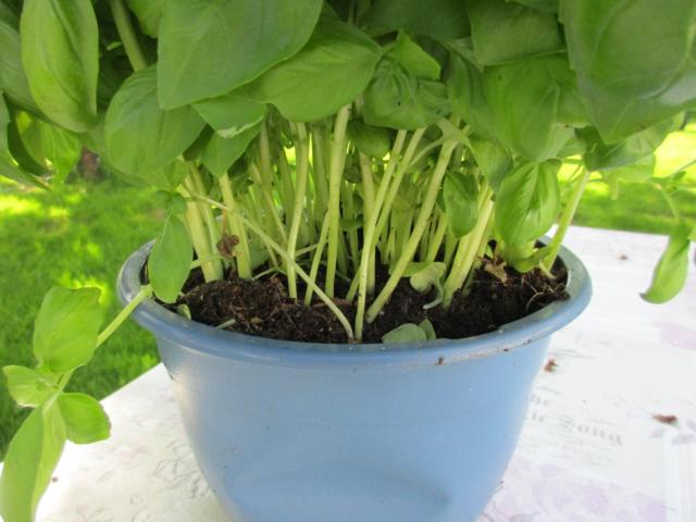 Gekaufte Basilikum -"Büsche" wie dieser bestehen in Wahrheit aus vielen Einzelpflanzen. Man kann sie also teilen. Man sollte auch, es ist ihnen nämlich viel zu eng in dem einen Topf, um gut zu gedeihen.