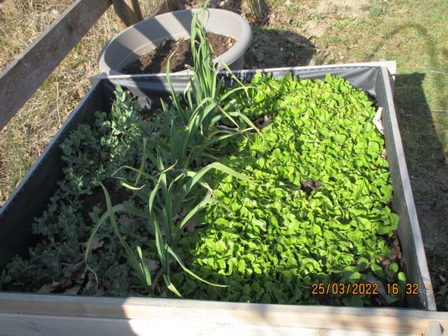 Der dicht gesäte Kopfsalat (Sorte Winterkönig) Ende März. Ebenfalls Anfang Oktober gesät.