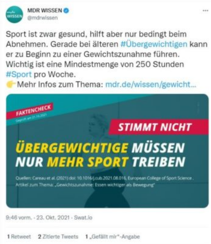 Vermutlich auch getrieben von der bei Linken immer öfter anzutreffenden Ablehnung körperlicher Ertüchtigung. Vermutlich im Bemühen, diese Aversion nicht allzu deutlich zu zeigen, kommt der Wissenschatsfaktenchecker des MDR dann zu dem Ergebnis: